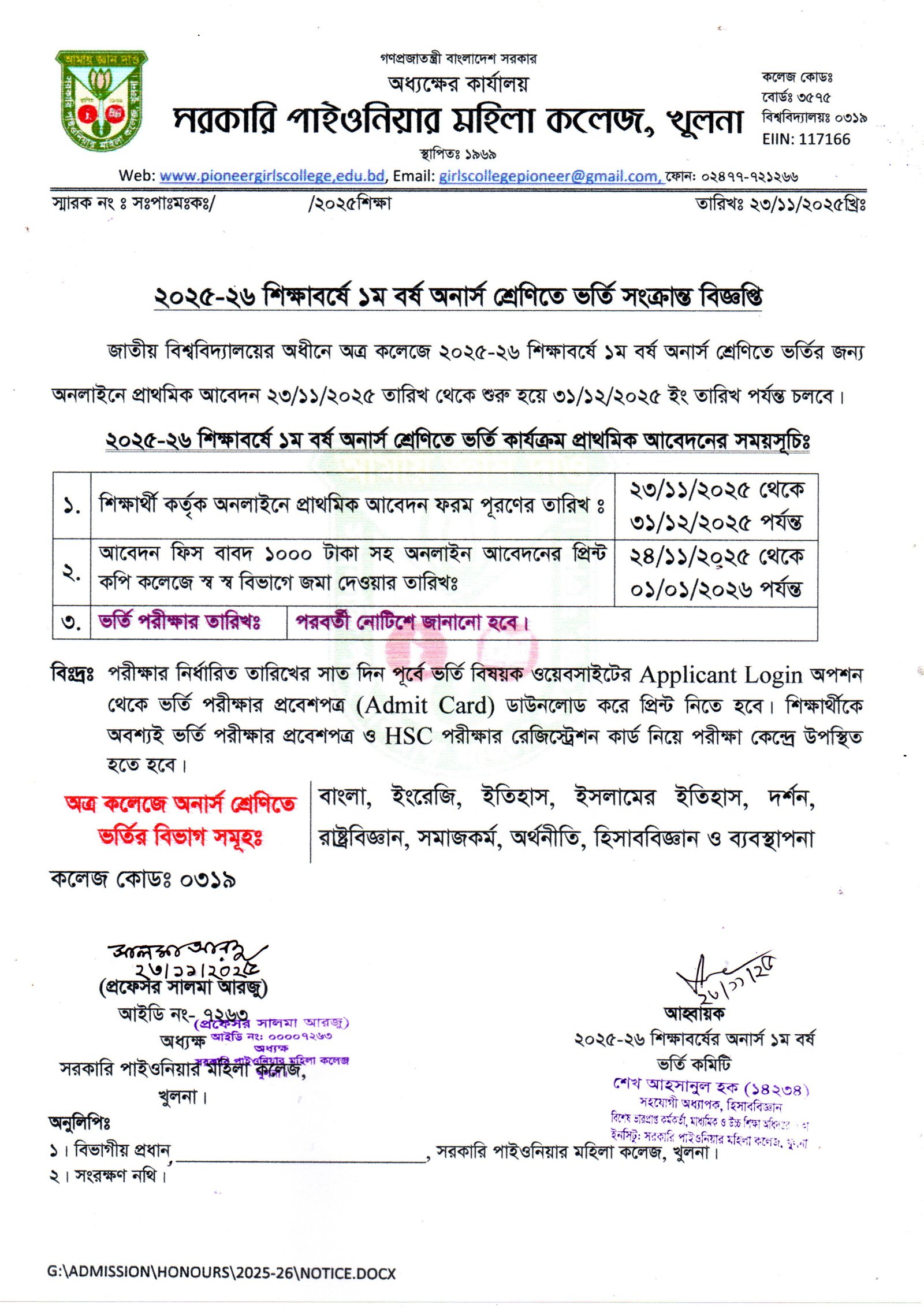 ২০২৫-২৬ শিক্ষাবর্ষে ১ম বর্ষ অনার্স শ্রেণিতে ভর্তি সংক্রান্ত বিজ্ঞপ্তি
