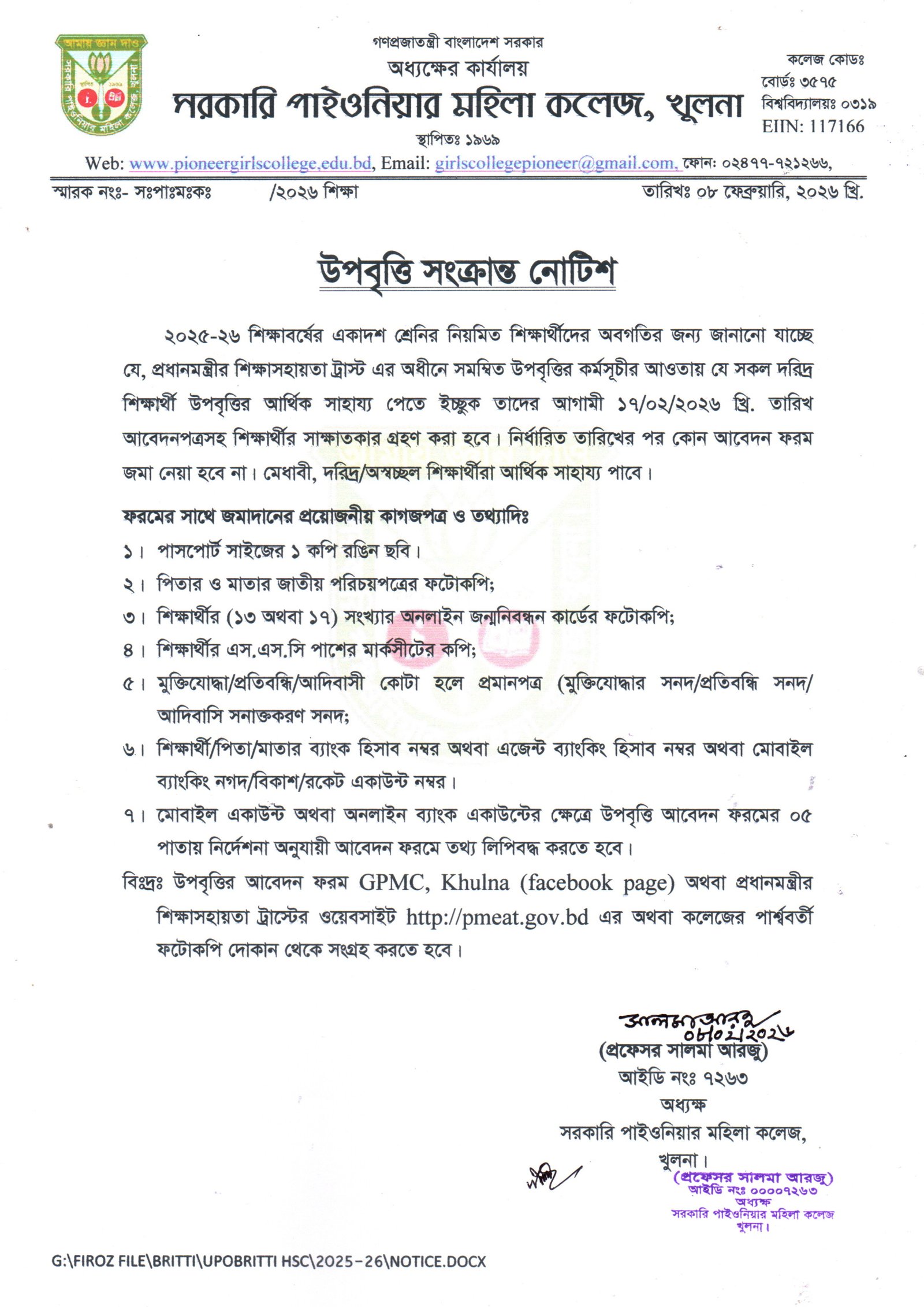 উপাধ্যক্ষ সরকারি পাইওনিয়ার মহিলা কলেজ