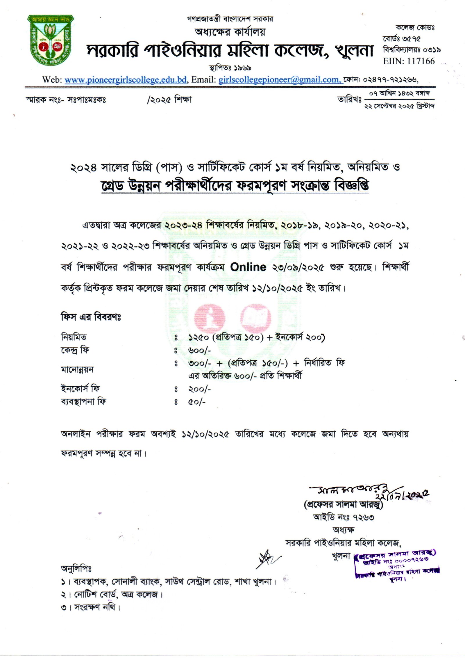 ২০২৪ সালের ডিগ্রী (পাস) কোর্স ১ম বর্ষ নিয়মিত, অনিয়মিত ও গ্রেড উন্নয়ন পরীক্ষার্থীদের ফরমপূরণ সংক্রান্ত নোটিশ
